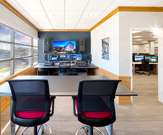 Video- och ljudelement sammanställs i redigeringssviter för att skapa tv-annonser, infoannonser, vanliga följetonger och dokumentärer om varje aspekt av Scientology – från våra ideala orger och allt de tillhandahåller sina närområden, till de unika anläggningar som byggts för att främja den globala rörelsen. Sändningsbyggnaden innehåller tio sådana redigeringsstudior.