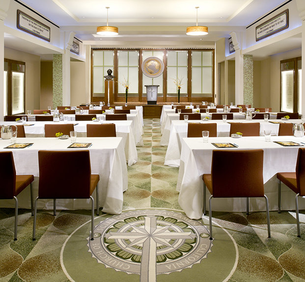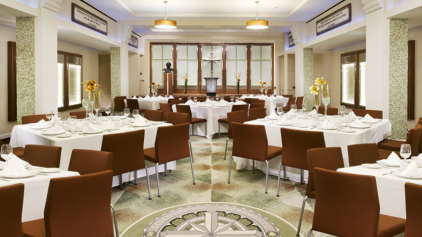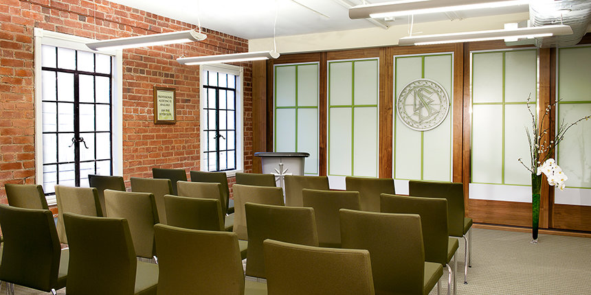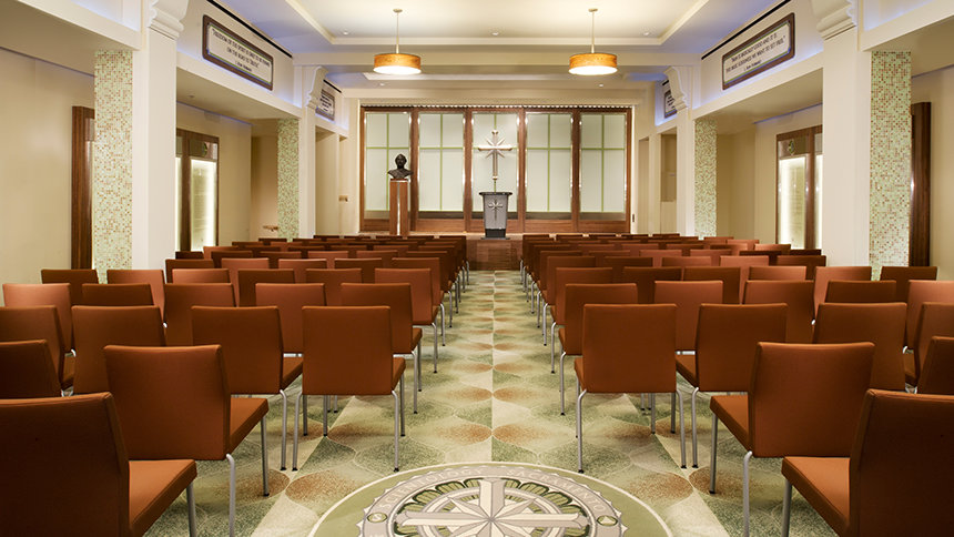 The Church’s new home, located just blocks from the State Capitol, is one of the city’s most prominent architectural landmarks. Originally opened in 1930 as the Ramona Hotel and designed by California’s first state architect, the building is Sacramento’s finest surviving example of the Spanish Colonial Revival style. The Church meticulously preserved the building’s structure and restored its features to their original glory, including the characteristic stucco, ornamental glazed brick and terra cotta tiles, decorative iron accents and the original blade sign. All restoration was planned and executed for minimal environmental impact and maximum sustainability, meeting the U.S. Green Building Council’s Leadership in Energy and Environmental Design (LEED) gold certification standards.