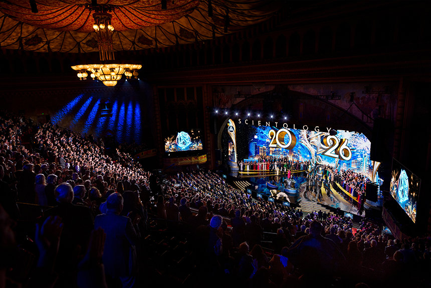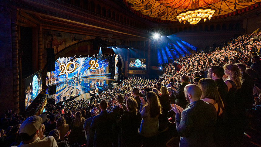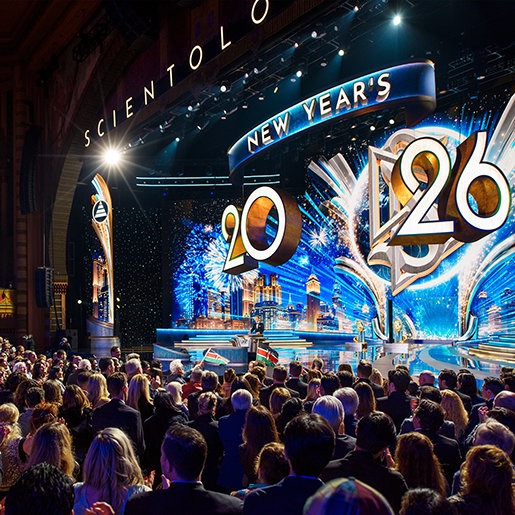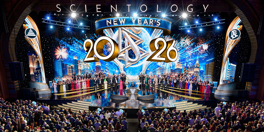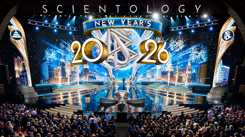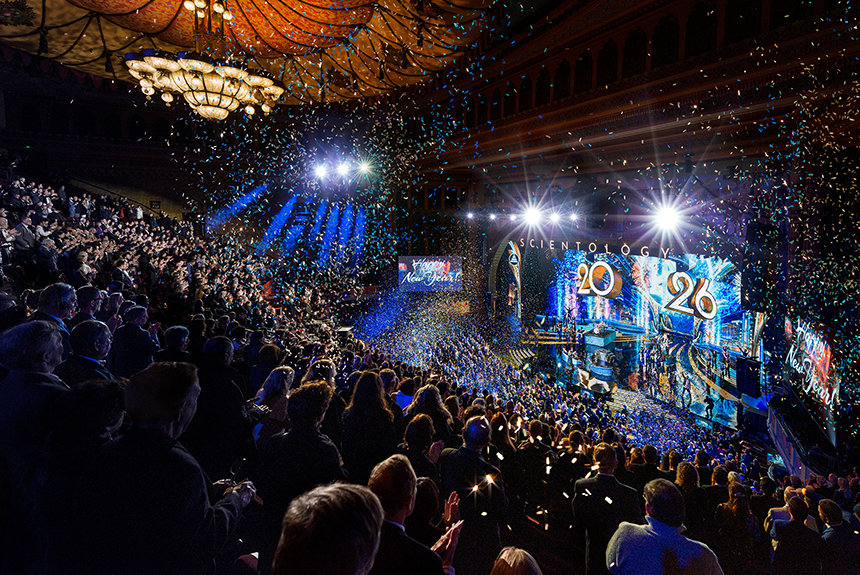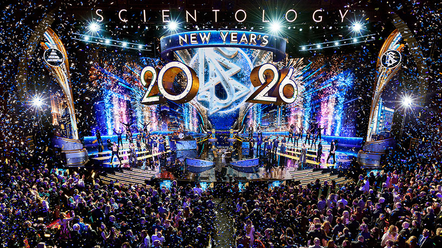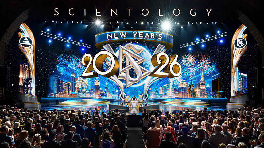 ”För de flesta i världen är nyår något de väntar på. De räknar ner sekunderna och tittar på klockan som om det är tiden som talar om för dem när livet börjar igen”, sade Mr. David Miscavige, religionen Scientologys kyrklige ledare. ”Men vi har aldrig levt tiden på det sättet. Så medan resten av planeten kanske fortfarande håller på att varva ner sina klockor, är vi här för något helt annat: för att se vad som händer när ett helt år av Scientology-prestationer släpps lös på en och samma gång.”