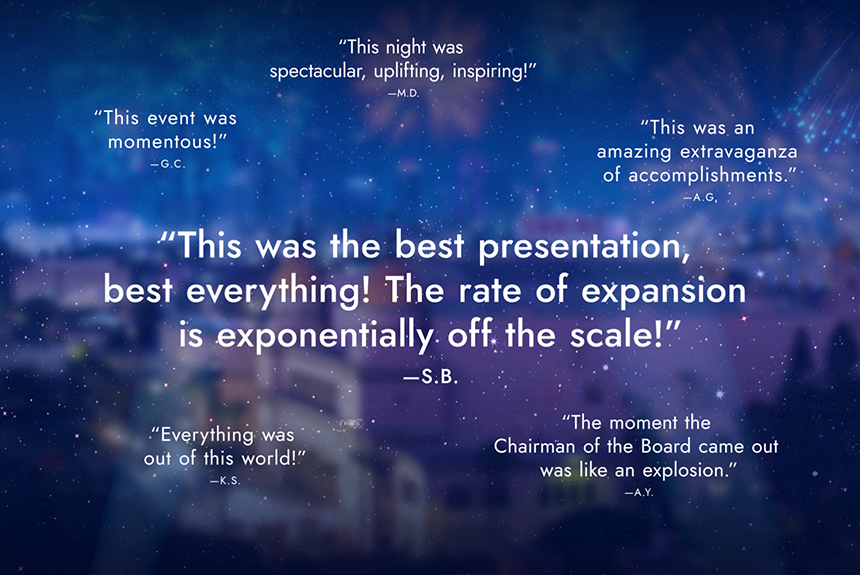 Som en spegling av ett år av expansion utan motstycke hyllas det högsta antalet Power-fältmedarbetare (Field Staff Members – FSMs) någonsin från 39 länder för att var och en ha eskorterat minst 100 personer in på och uppför Bron till Total Frihet under de senaste 12 månaderna. Kronan på verket för presentationen är en rekordstor grupp av Elite FSMs, som var och en hedras för att ha väglett hela 1 000 eller fler personer uppför Bron under samma period.